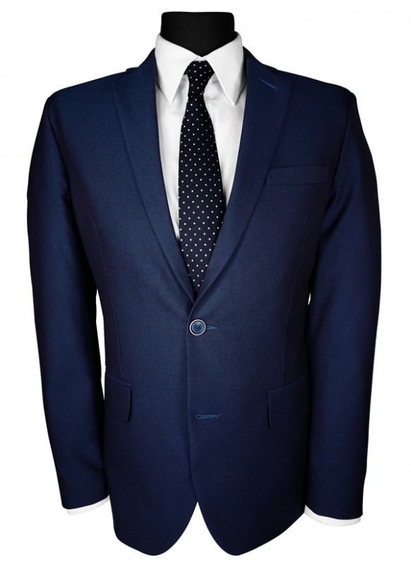 Eleganacka marynarka garniturowa granatowa. Materiał o charakterystycznej fakturze ze subtelnym połyskiem Krój typu Fit. Na życzenie Klienta możliwe jest wykonanie stebnowania – ozdobnego szycia tworzącego pojedynczą linię przy krawędzi klap.